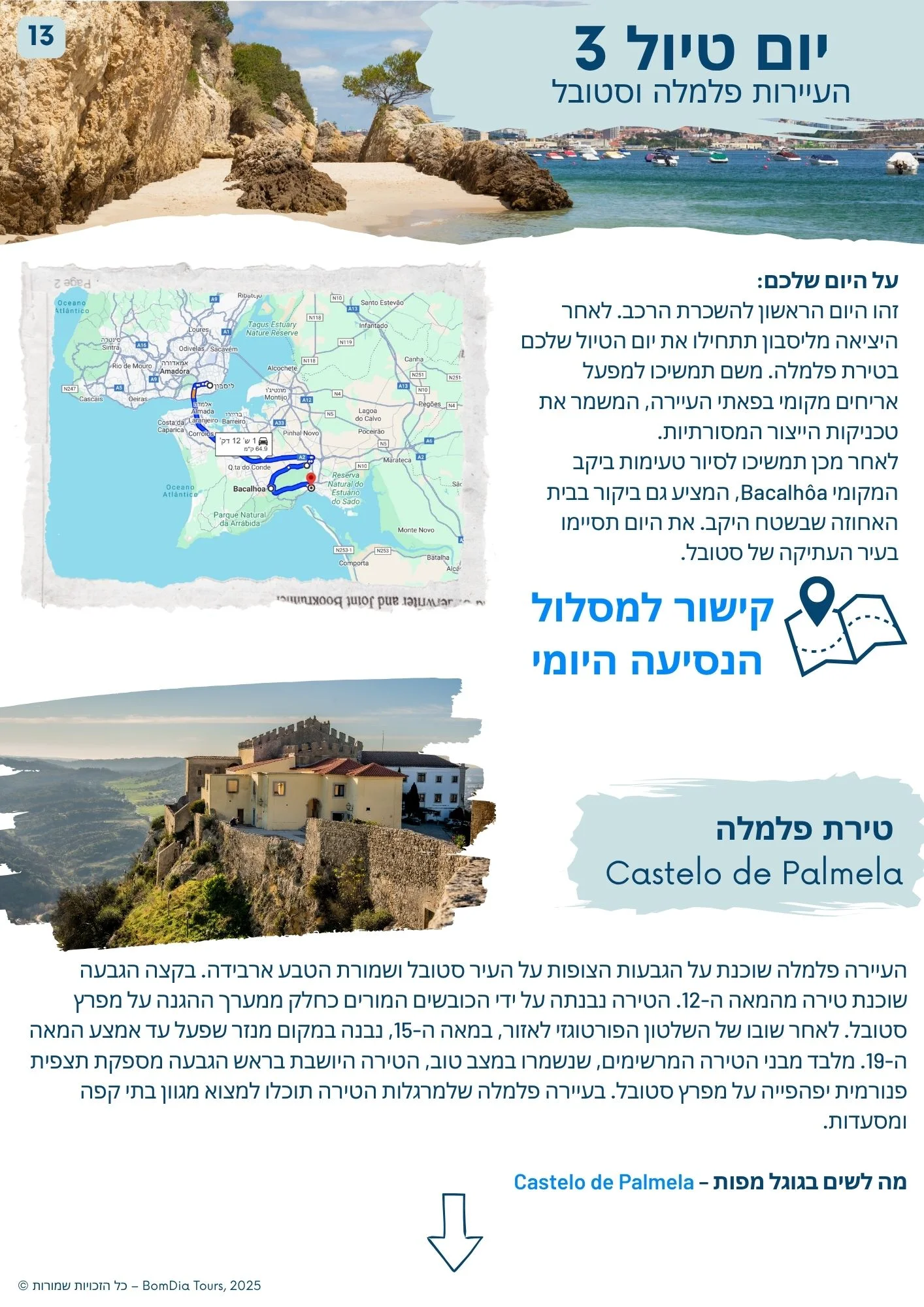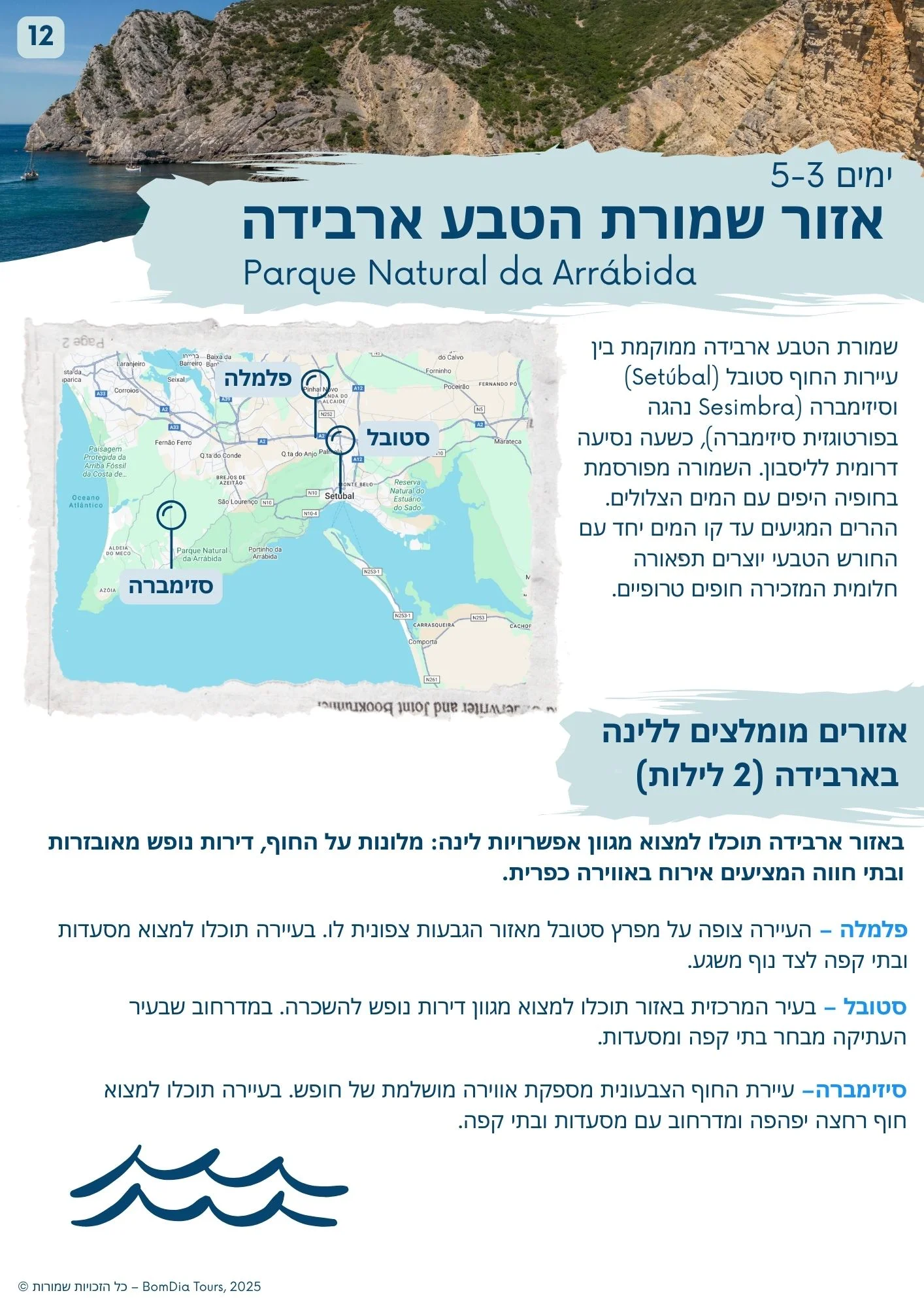העיר ליסבון ← שמורת הטבע ארבידה ← העיירות סטובל וססימברה ← חבל אלגרבה ← שמורת הטבע ריו פורמוזה ← העיירות לאגוש, אלבופיירה וסאגרש ← טירת סילווש ← חבל אלנטז׳ו ← עיר המבצר מונסראז ← העיר אבורה